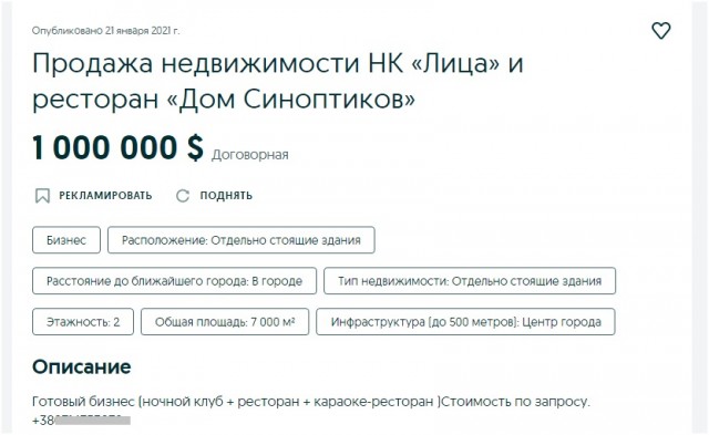 В то же время, объявление о продаже НК «Лица» и ресторана «Дом Синоптиков» появилось на OLX 21 января 2021.