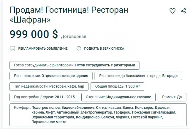 В тексте объявления сказано: «Этот объект продажи уникален своей историей в нашем любимом городе. Только услышав его название становится теплее на душе. Комплекс в ожидании нового заботливого Хозяина».