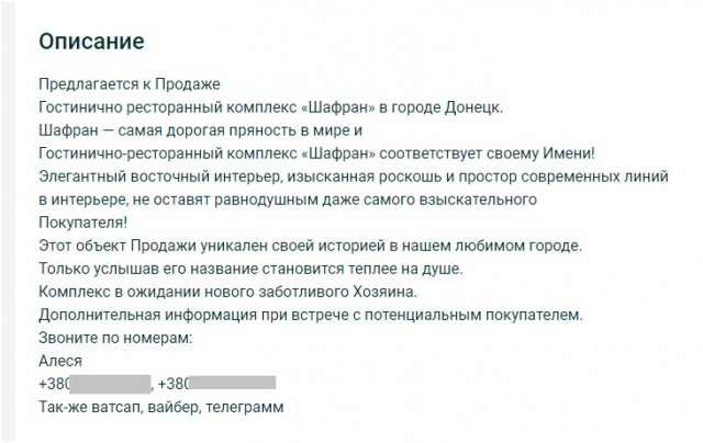 Источники сообщают, что во временно оккупированном Донецке выставлены на продажу ночной клуб «Лица», ресторан «Дом Синоптиков» и гостинично-ресторанный комплекс «Шафран». Объявление о продаже «Шафрана» размещено на OLX 10 февраля 2021. Его стоимость составляет — $ 1 000 000.