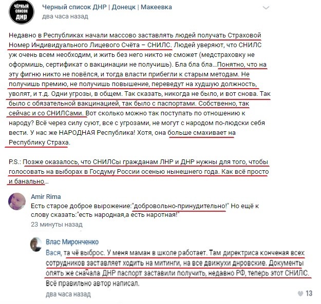 «Та чё выброс. У меня маман в школе работает. Там директриса конченая всех сотрудников заставляет ходить на митинги, на все движухи днровские. Документы опять же сначала ДНР паспорт заставили получить, недавно РФ, теперь этот СНИЛС. Всё правильно автор написал».