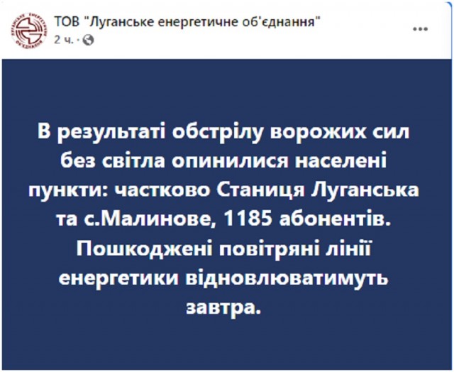 «Луганское энергетическое объединение» сообщает, что частично обесточены Станица Луганская и село Малиново — всего почти 1 200 абонентов. Поврежденные линии электропередачи планируют восстанавливать завтра.