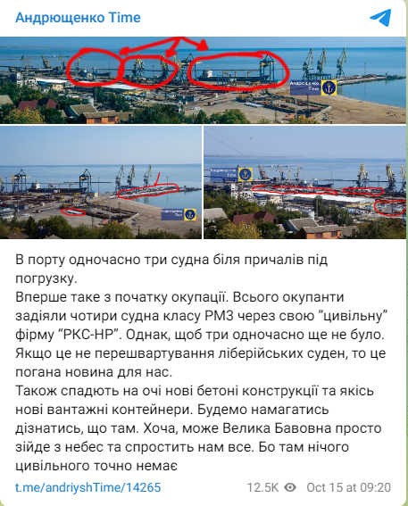 «У порту одночасно три судна біля причалів під навантаження. Вперше таке з початку окупації. Всього окупанти задіяли чотири судна класу РМ3 через свою «цивільну» фірму «РКС-НР», — підкреслив посадовець у Telegram.