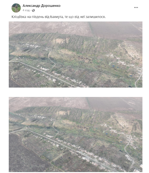 «Кліщіївка на південь від Бахмута. Те, що від неї залишилося», — підписав знімки військовий.