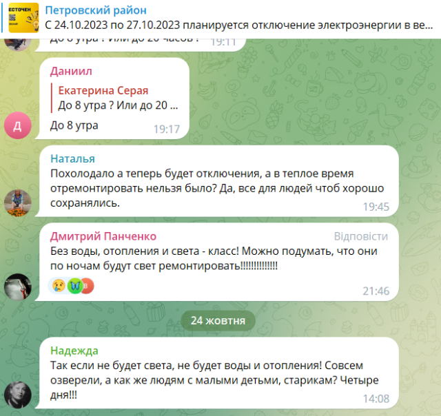 У коментарях під публікацією люди висловлюють невдоволення, оскільки відключення світла відбувається систематично.