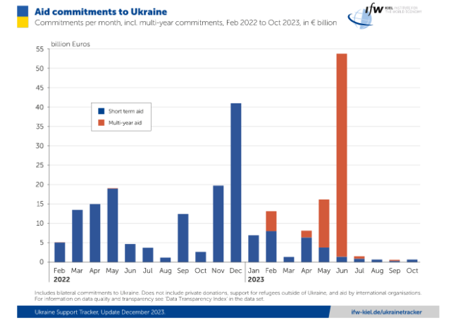 За останніми даними Кільського Інституту світової економіки допомога Україні впала до історичного мінімуму. У період з серпня по жовтень 2023 року загальна вартість нових пакетів оцінюється всього 2,11 млрд євро-найнижча сума з січня 2022 року.