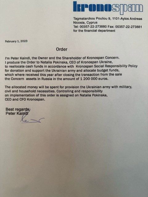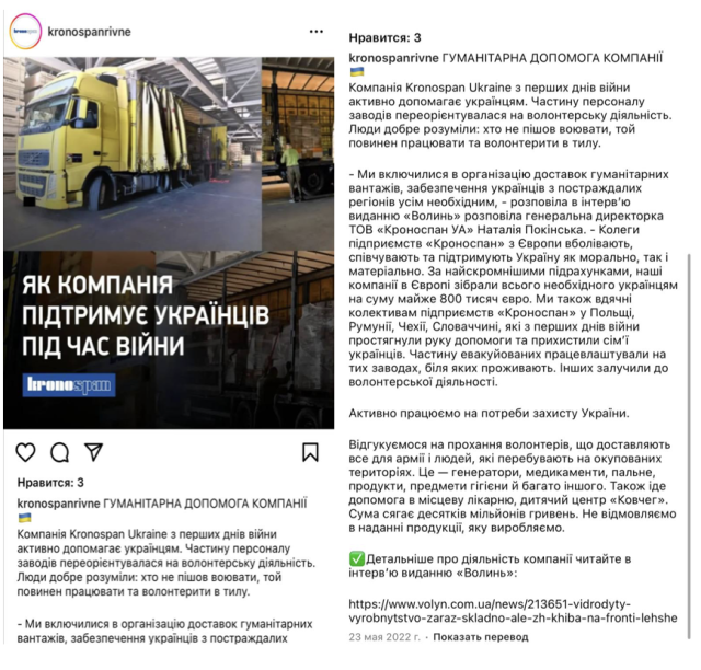 Генеральний директор також розповів про підтримку України з боку „Kronospan“, включаючи фінансування української армії та надання гуманітарної допомоги.