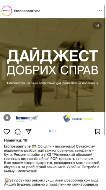 »На зібрані кошти компанією в Рівненській області України ми провели реконструкцію госпіталю реабілітації ветеранів війни. Закупили сучасне обладнання, також більше 1,5 млн гривень компанія «Кроношпан Рівне” витратила на проведення реконструкції відділення <…> Так, ми провели величезну роботу і об’єднали навколо проблеми в Україні багато країн, які відгукнулися на наші заклики і регулярно надають фінансову допомогу, переказуючи значні фінансові кошти. Я особисто взяв участь і переклав у фонд 500 тисяч євро, які були направлені в Україну для потреб ЗСУ”, – підкреслив бізнесмен.