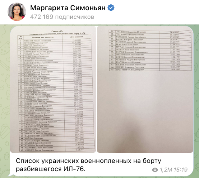 Після цього посилило дезінформаційний вплив Кремля і те, що російська державна пропагандистка Маргарита Симоньян опублікувала фотографії так званого «Списку 65», стверджуючи, що це список саме тих військовополонених, які перебували на борту Іл-76. Вона намагалася підвести українців до думки, що у літаку насправді були українці, які нібито загинули через безпринципність українського військово-політичного керівництва.