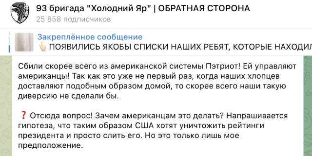 Наприклад, деякі українські Telegram-канали навіть почали поширювати відверто конспірологічні версії, згідно з якими начебто особисто американці стоять за цією катастрофою, метою якої є завдати удар по президенту України Володимиру Зеленському та схиляння його до переговорів з ворогом.