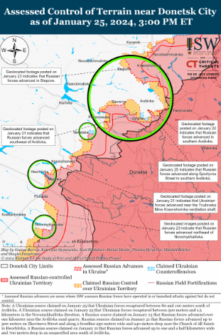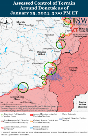 За інформацією ISW, на Бахмутському напрямку в результаті потужних зіткнень окупаційні війська мають просування на південний захід від Степового і вздовж вулиці Спортивної в найпівденнішому житловому районі Авдіївки.