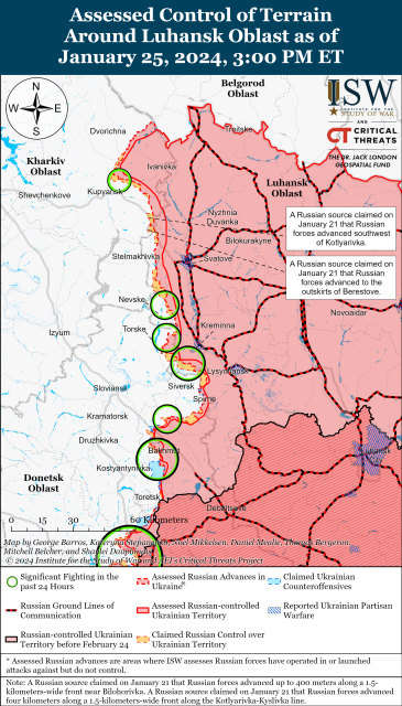 Важкі позиційні бої тривають і на північний захід від Сватового біля Стельмахівки, на північний захід і захід від Кремінної біля Ямполівки, Макіївки, Торського, Тернів; поблизу Діброви і Серебрянського лісу; біля Білогорівки.