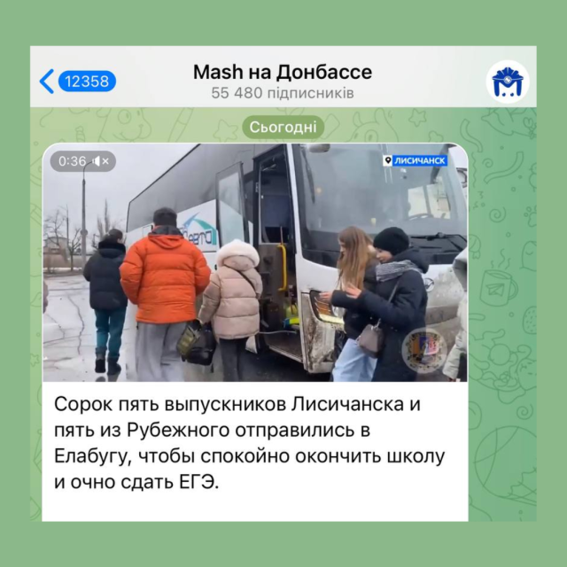 Сорок п'ять учнів з Лисичанська та п'ятеро з Рубіжного були перевезені до міста Єлабуга у Татарстані, де вони повинні продовжити свою освіту до кінця навчального року.