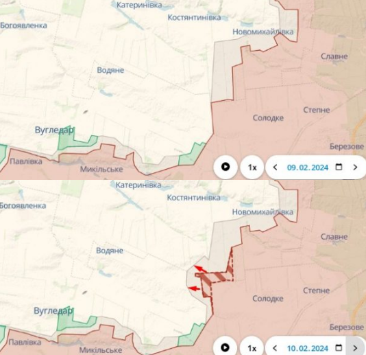 Військовий експерт і укладач фронтових карт DeepState підтвердив цей факт, опублікувавши відповідні карти за дев'яте і десяте лютого. На другій карті червоним пунктиром і штрихуванням позначена територія, де окупанти змогли закріпитися.