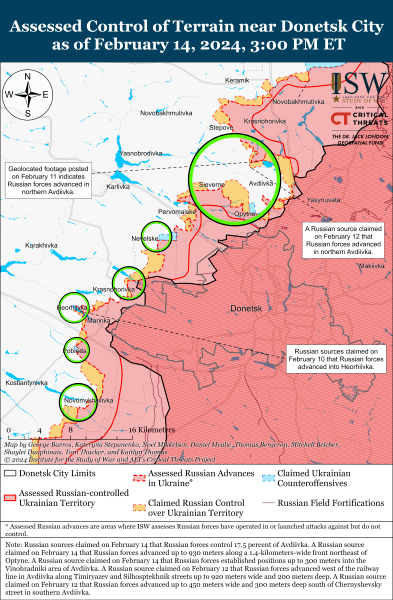 У пропагандистських ЗМІ росіян кажуть, що війська РФ контролюють близько 17,5% території Авдіївки, в ISW ж не підтверджують цей факт, за їхніми даними на 14 лютого, противник захопив приблизно 15,4% міста.