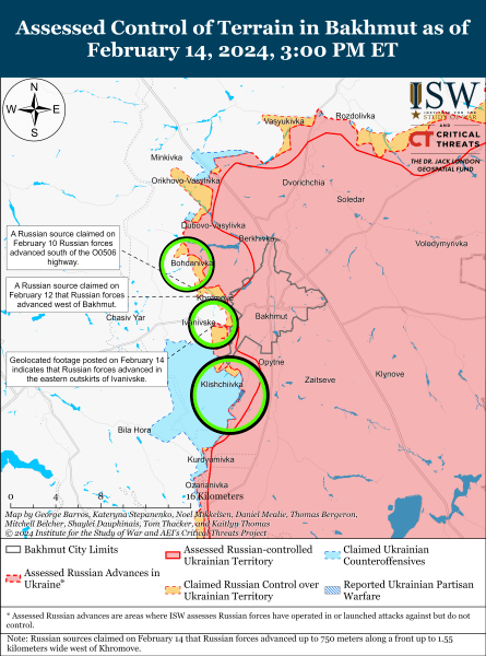 За інформацією рашиських видань, противник просунувся на відстань до 1,5 кілометрів завширшки й 750 метрів у глибину на південь від Богданівки (на північному заході від Бахмута), проте експерти з ISW не змогли підтвердити цю інформацію візуально.
