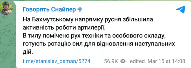 Боєць ЗСУ 24-ї окремої штурмової бригади «Айдар» Станіслав Бунятов (Осман) повідомив, що загарбники стали активніше використовувати артилерію в районі Бахмута.
