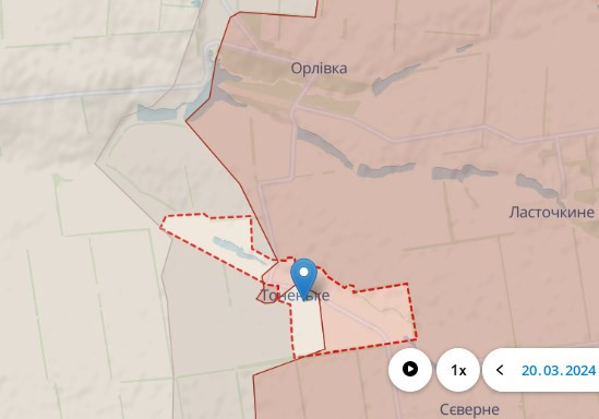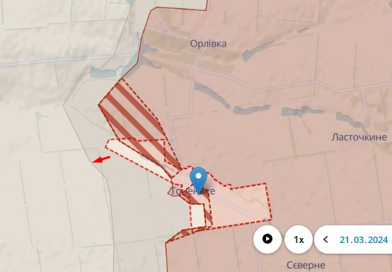 Аналітичний канал оприлюднив скриншот своїх мап за 20 і 21 березня, на останній він червоним пунктиром і штрихуванням позначив захоплену територію, на якій встигли закріпитися ворожі війська. За інформацією військового експерта, раніше ця територія була сірою зоною, але зараз вона дещо розширилася в нашу сторону, що позначено червоною стрілочкою.