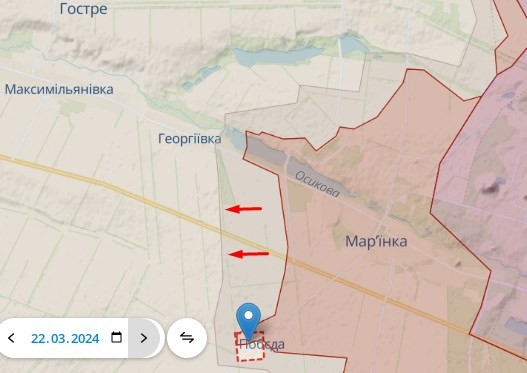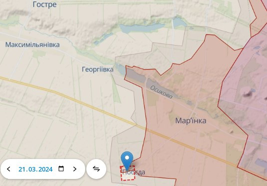 За словами експертів, просування противника зафіксовано біля нещодавно захопленого міста Мар'їнка.Надані відповідні карти за 21 та 22 березня, на останній червоними стрілочками позначено розширення сірої зони в наш бік між частково окупованими населеними пунктами Побєда та Георгіївка.