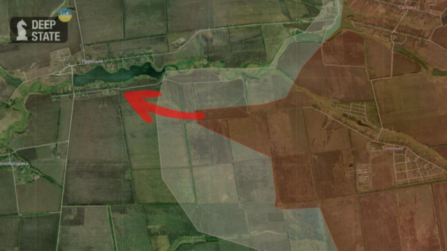 Аналітичний центр «DeepState» оприлюднив скріни зі своїх геолокаційних мап, на яких можна побачити, що російські окупанти фактично взяли під контроль посадки між селами Уманське та Тоненьке.