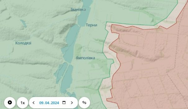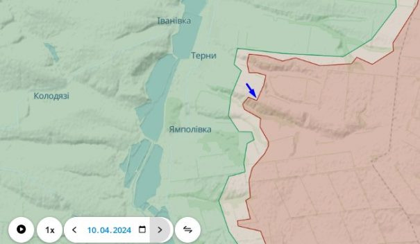 Для порівняння аналітичний центр надав скріни зі своїх карт за дев'яте і десяте квітня, де на останній синьою стрілочкою позначено місце розширення сірої зони в бік противника.