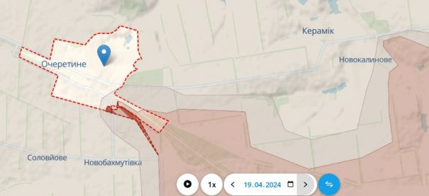 Аналітик надав скріншот своєї карти на цій ділянці фронту за 19 квітня, на якому червоно-коричневим штрихуванням та пунктиром позначена невелика втрачена територія українськими бійцями.