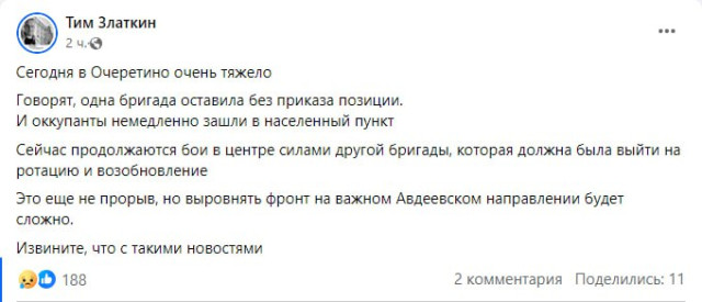 У свою чергу, український волонтер Тім Златкін також заявив на своїй сторінці у Фейсбуці, що через важку ситуацію в населеному пункті українські бійці вирішили врятувати свої життя та нібито самовільно пішли зі своїх позицій.