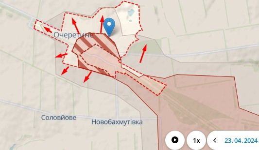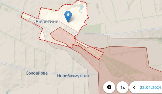 Про це пише видання «Реал».Експерт оприлюднив скріншоти зі своїх мап за 22 квітня, а також на початок поточного дня 23 квітня, на останній червоно-коричневим штрихуванням та пунктиром позначені втрачені території українських військових, на яких вже встигли закріпиться окупанти.