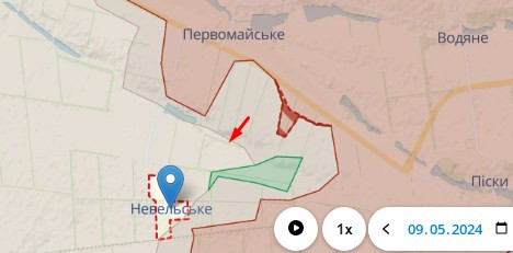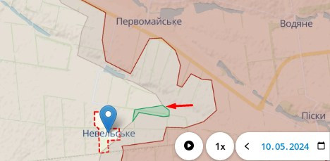 Експерт оприлюднив скріни зі своїх карт за 9 та 10 травня, в яких червоно-коричневим штрихуванням і пунктиром позначив втрачену територію, на якій закріпилися російські війська.