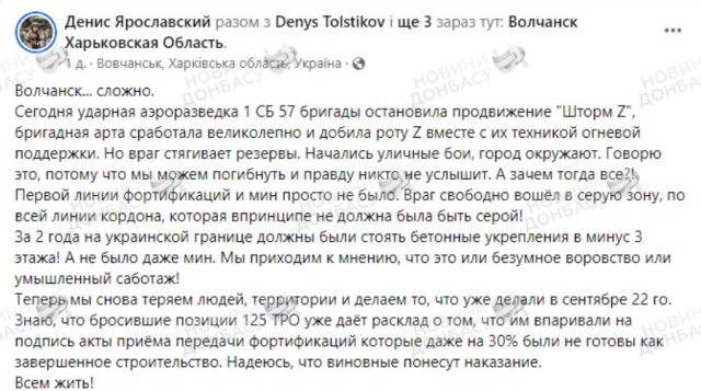 Командир підрозділу розвідки, Денис Ярославський, висловив занепокоєння станом захисту кордонів, зазначивши, що на першій лінії оборони відсутні міни, що дозволяє противнику вільно проникати в сіру зону.