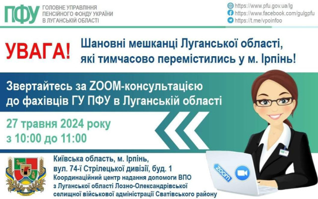 У понеділок, 27 травня, в Ірпені відбудеться онлайн-консультування для внутрішньо переміщених осіб (ВПО) з питань пенсійного забезпечення, субсидій та пільг. Захід організовується Лозно-Олександрівською громадою і буде проходити у хабі громади з 10:00 до 11:00.