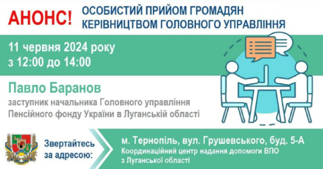 Для переселенців, які перебувають у Тернополі відбудеться особистий прийом заступника начальника Головного управління Пенсійного фонду України в Луганській області Павла Баранова.