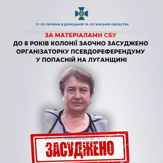 За інформацією Служби безпеки України, засуджена, яка до війни підтримувала політику Кремля, брала активну участь у підготовці та проведенні псевдореферендуму у вересні 2022 року.
