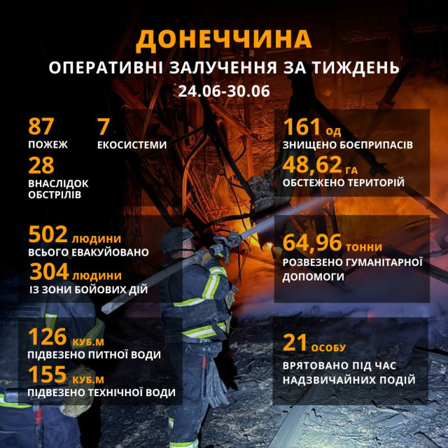 У повідомленні ДСНС йдеться, що з 24 червня по 30 червня рятувальникам вдалося евакуювати мирних громадян з міста Торецьк, села Дружба, села Нью-Йорк, Петрівка, Щербинівка та Північне Бахмутського району.