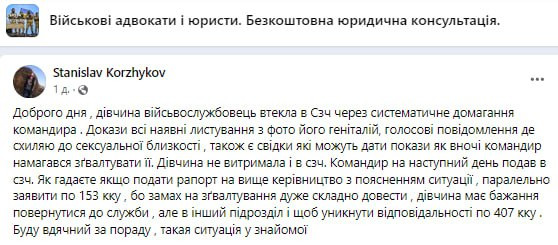 Вказується також, що обвинувачений вже подав рапорт на своє відставлення з посади. Особа, яка поділилася цією інформацією, зауважила, що планує подати рапорт на вище керівництво та звернутися до військової прокуратури згідно зі ст. 153 ККУ, яка передбачає покарання за замах на зґвалтування.