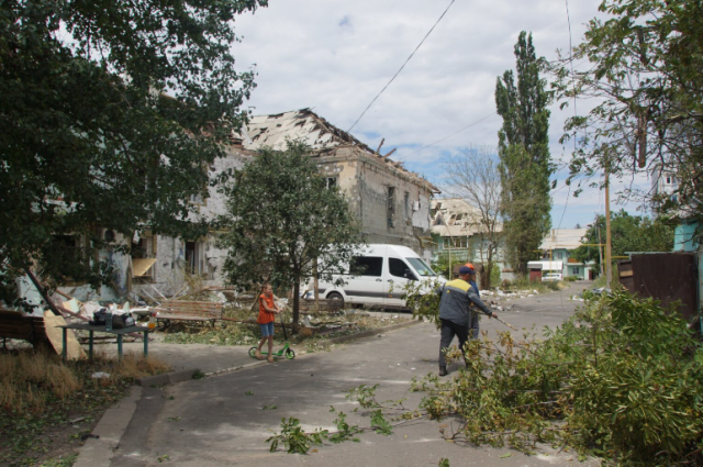 За її словами, в місті досить багато є і підлітків.Наприклад, хлопчик на фото, який приїхав на самокаті подивитися наслідки прильоту в Кураховому.