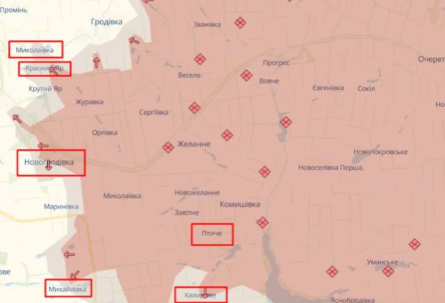 Військовий експерт «DeepState» оновивши карту бойових дій в Україні повідомив, що за минулу добу противник зміг знатно просунутися на фронті.Зокрема, ворожа армія захопила населений пункт Птиче та продовжує наступ в районі інших населених пунктів на Покровському напрямку.