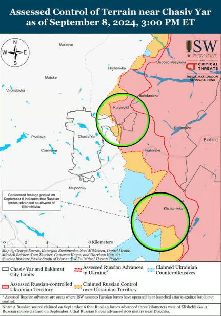 Ворожі сили продовжують тиснути біля Часового Яру, Андріївки, Кліщіївки, а також у напрямку Майського. Геолокаційні кадри від 8 вересня показують, що росіяни просунулися на сході Торецька Донецької області.