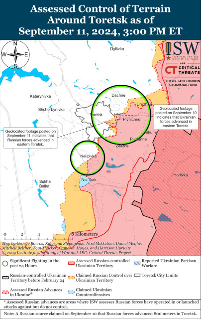 Разом з цим, аналітики відзначають, що 10 та 11 вересня противник продовжив наземні атаки в околицях Дачного (північний схід від Торецька), Північного (схід від Торецька) та Нелипівки (південь Торецька).