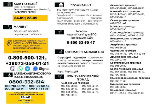 Безкоштовна евакуація громадян з Донеччини в Чернівецьку область у вересні буде організована спеціальним потягом 24 та 28 числа.