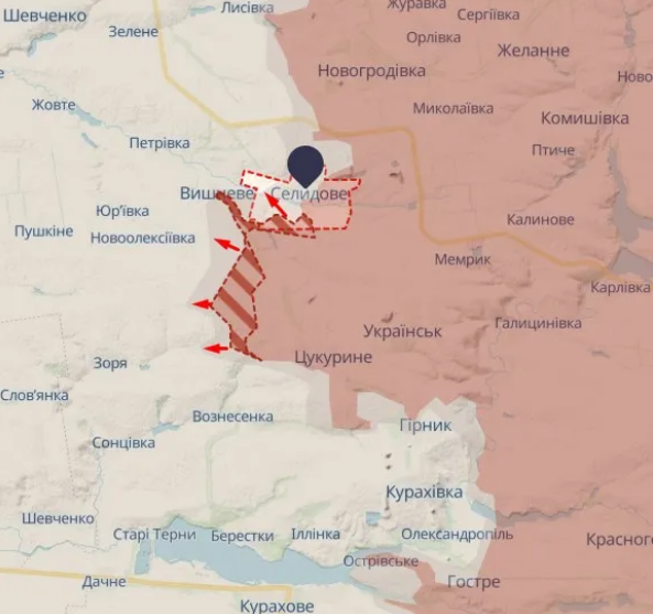 За минулу добу російські окупанти просунулися в Селидовому Донецької області, прорвавшись з півдня в село Вишневе, розташоване на захід від міста. Також противник захопив сусідні території.