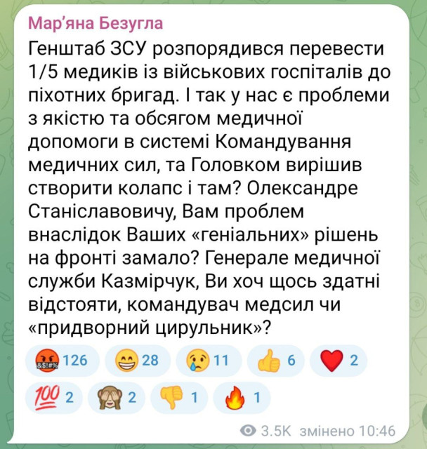 Безугла висловила думку, що такі зміни можуть спричинити ще більший хаос у медичній сфері та розкритикувала головнокомандувача ЗСУ Олександра Сирського за нібито спробу створити проблеми у цій сфері.