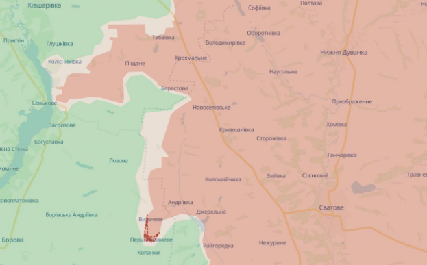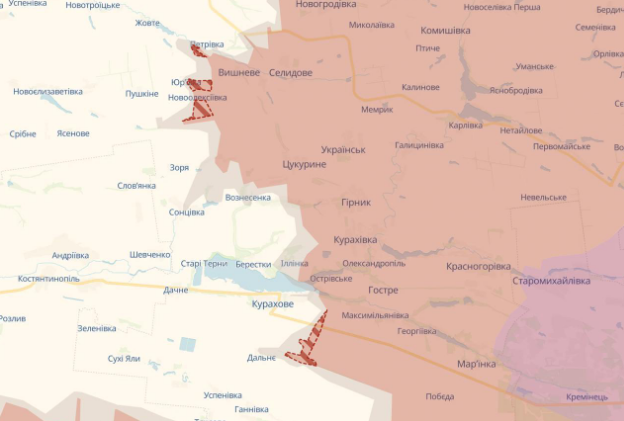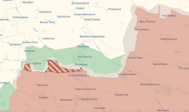 «Ворог просунувся в Першотравневому (Наукове з 2024 року), у Нелипівці, біля Дар'їно, Петрівки, Юр'ївки, Новоолексіївки, Дальнього, Макарівки, Рівнополя та Новодарівки», — заявили в DeepState.