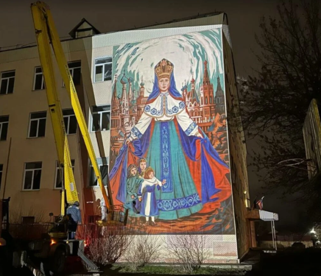 На фасаді 44-ї школи в тимчасово окупованому Луганську вже завершено створення муралу із зображенням «Матушкі Землі» в кольорах російського триколора.