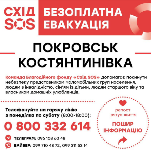 Мешканці Покровська та Костянтинівки можуть скористатися безкоштовною евакуацією з регіону завдяки благодійному фонду «Схід SOS». Влада Донеччини настійно закликає людей покинути небезпечні райони і попрямувати в більш захищені території.