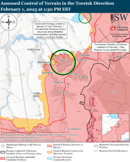 Водночас, 31 січня, Міністерство оборони країни-агресора повідомило про захоплення села Кримське, розташованого на північ від Торецька, проте ISW не підтвердили цю інформацію.