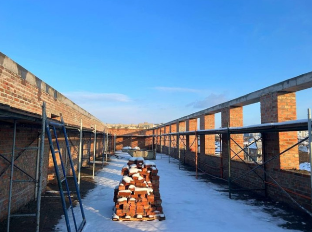 За інформацією пропагандистів, підрядники вже завершили цегляну кладку зовнішніх стін та виконали розводку мереж водопостачання та каналізації. Також посилили віконні та дверні прорізи, проведено монтаж заземлення, армування та бетонування.