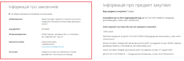 У відділі культури, туризму та охорони культурної спадщини Покровської міської ради оголосили тендер на закупівлю рослин на суму 99 тис грн. За ці кошти планується придбати 1265 одиниць рослинної продукції, включаючи гіпсофіли, троянди, хризантеми та гвоздики, які будуть використовуватися для складання букетів.Термін поставки товарів встановлено до 31 грудня 2025 року.