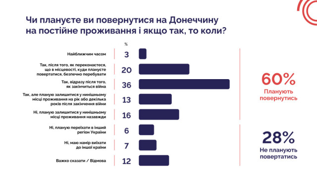 60% респондентів, які планують повернутися на Донеччину, назвали любов до рідного населеного пункту та ностальгію ключовими причинами. Ще 47% вважають важливим фактором наявність уцілілого житла або можливість отримати нове від держави. Водночас 28% опитаних заявили, що не планують повертатися.
