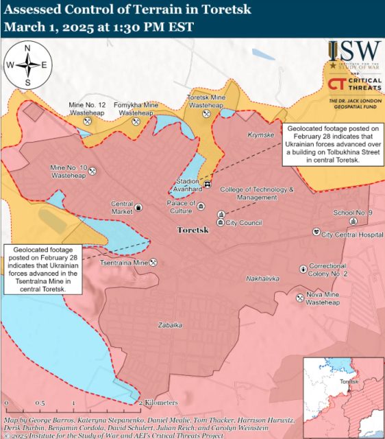 Крім того, бійці ЗСУ активно проводять диверсійно-розвідувальні операції в околицях породного відвалу шахти №10 на північному заході Торецька та в декількох інших ключових точках. Незважаючи на це, значна частина міста залишається «сірою зоною», що створює схильність до можливого перекидання російських військ для посилення своїх позицій.