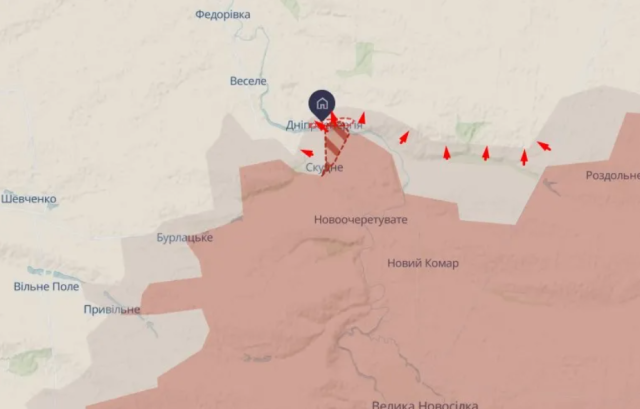 Російські війська значно просунулися на Новопавлівському напрямку, зміцнившись у південній частині села Дніпроенергія, розташованого в Комарській сільській громаді Волноваського району Донецької області.